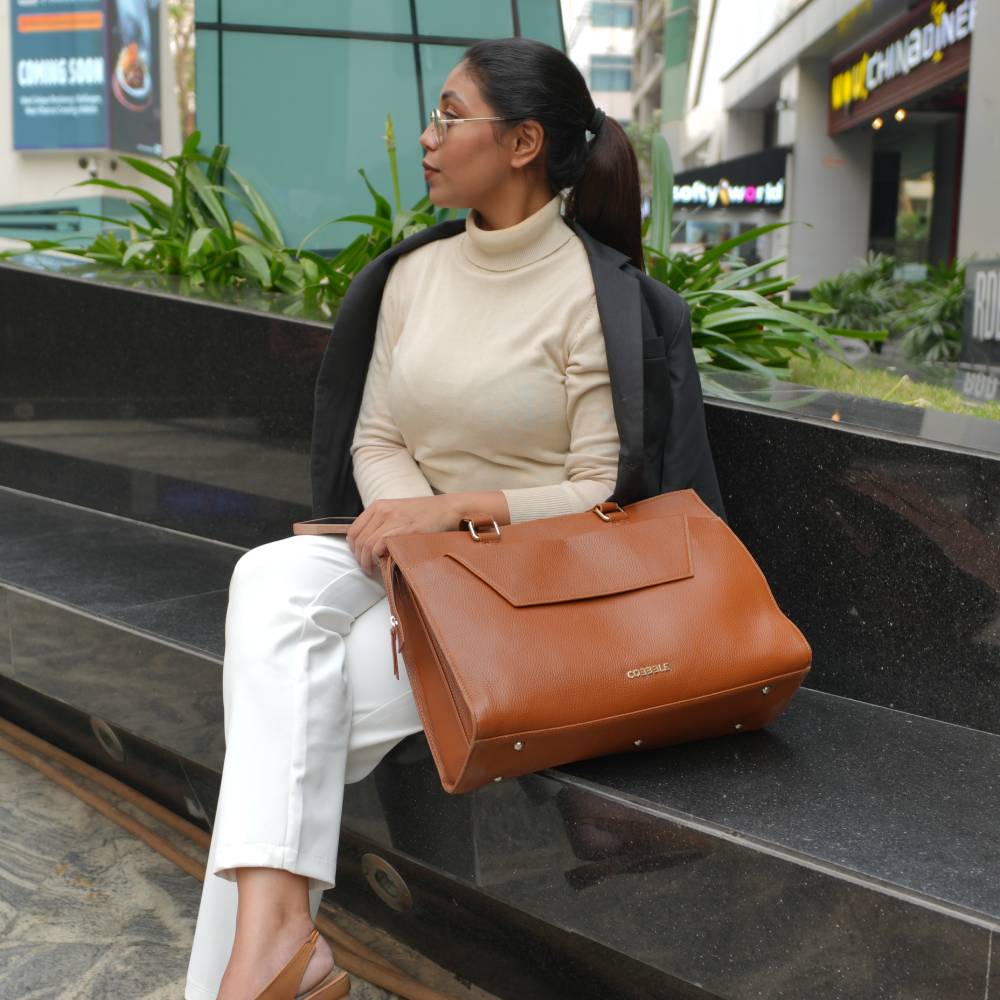 Cobbble Woman Shoulder Laptop Bag - Tan, Multi-Pocket